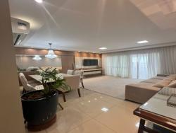 Apartamento mobiliado, com móveis laqueados na sacada e sala, além de cortinas em todos os cômodos.